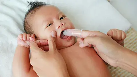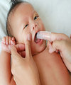 - Gunakan sedikit pasta gigi bayi (dengan flouride) dan perlahan usapkan